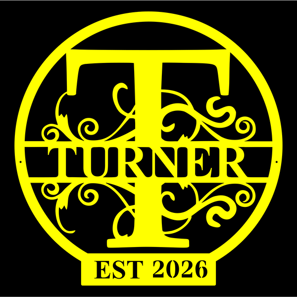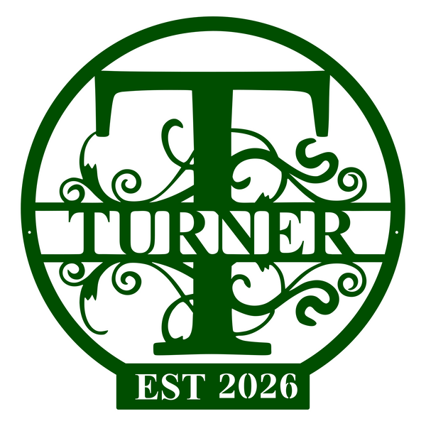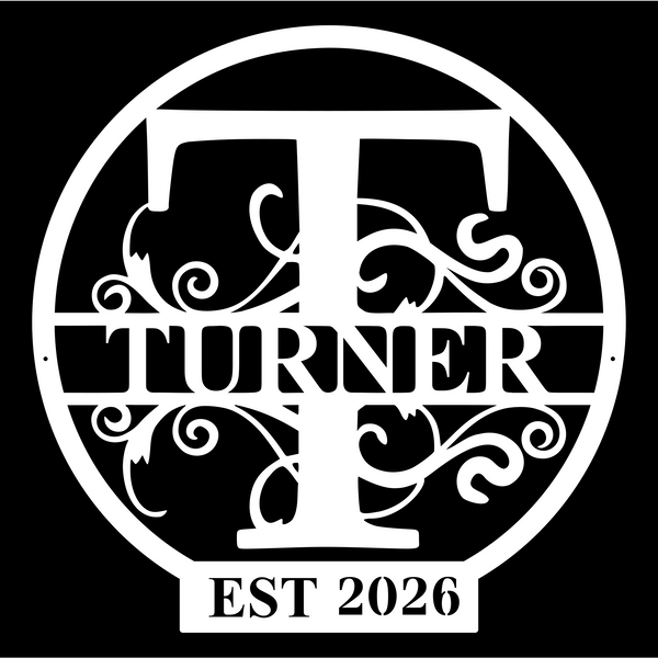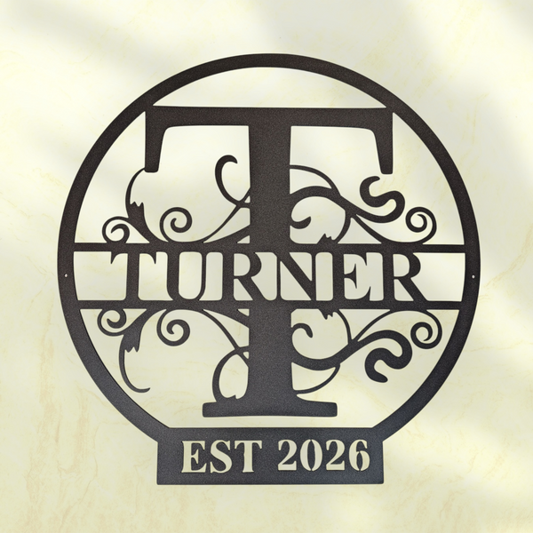 Elevate your home décor with this custom round metal monogram sign, handcrafted by Tinkerin Metal Art. Designed with a bold fancy monogram initial, your family last name layered across the center (up to 7 letters), and an established date, this piece adds a timeless and meaningful touch to any space.